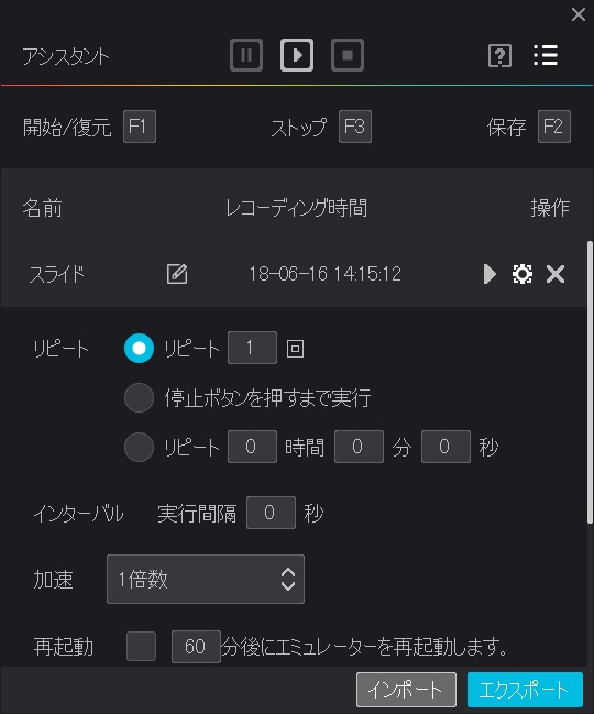 設定を開くと、リピート回数や、何時にマクロを起動させるか、実行間隔や再生速度まで。事細かく色々と設定できるので、ワンパターンなゲームの自動化にもってこい…な機能ですね。