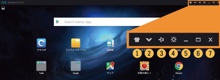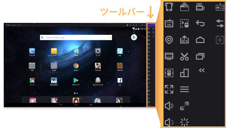 覚えておいて欲しい「基本」。Nox Playerに用意されている大量の機能は、そのほとんどが右側に表示されている「ツールバー」から使えるということ。