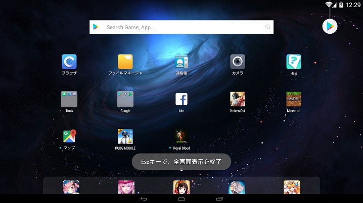 ESCで全画面表示モードを解除できる。ちなみに、全画面表示に切り替えてもNox Player側の解像度はそのままスケーリングするので、全画面の画質が粗くなる可能性があります。たとえば、Nox Player側の解像度が1440 x 900で、全画面時の解像度が1920 x 1080だと画質が粗くなる。気になる場合は「システム設定」から、Nox側の解像度を変更すればOK。