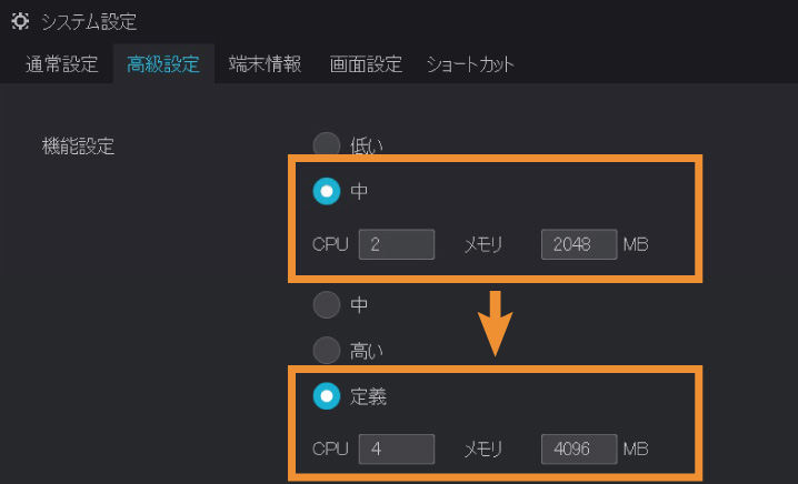 重たいゲームを動かしたときに、動作が重たい…という時は「機能設定」からCPUのコア数とメモリ容量を増やせばOK。