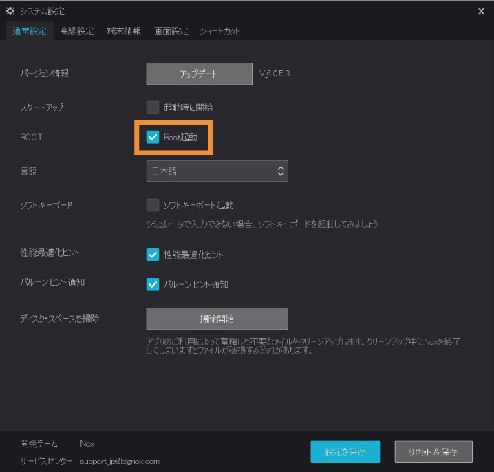 システム設定が開くので、「Root起動」にチェックを入れて「設定を保存」します。