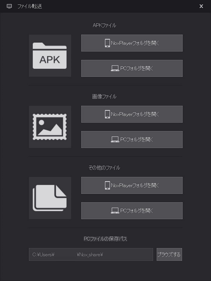 自分が今使っているNox Playerの各種フォルダにアクセスできる機能です。