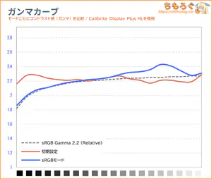 手動調整後のガンマカーブとグレースケール(色温度)グラフです。