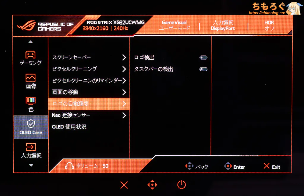 ASUS XG32UCWMGは明るさに関して保守的な設計がされています。そのため、OLED保護機能の自由度が高いです。