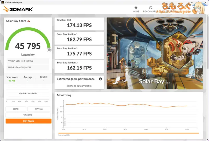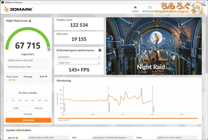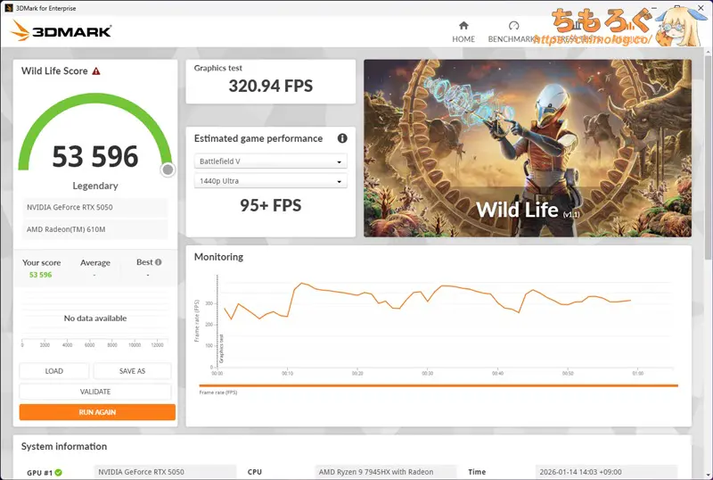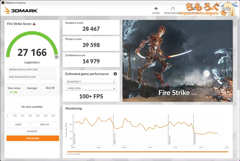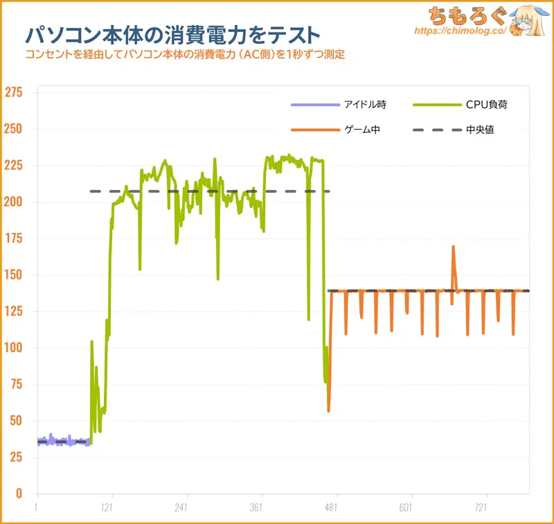 ゲームプレイ(RTX 5050)時の消費電力が140 W前後です。