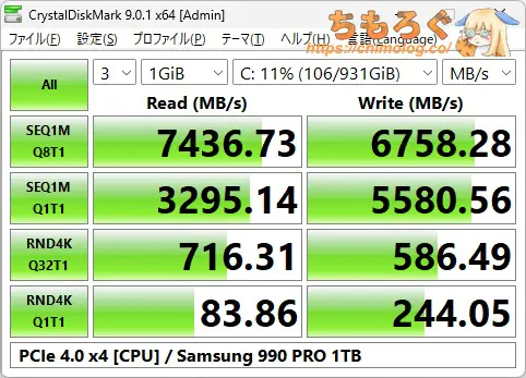 また隠し仕様といいますか自己責任ではありますが、同じく7945HX搭載のBD795MではUEFI上でM.2の信号仕様をAutoにすると仕様表では4.0×4のはずが5.0×4で使えるようになります(特定バージョン以降のUEFIのデフォで4.0に制限をかけてあるようです)。