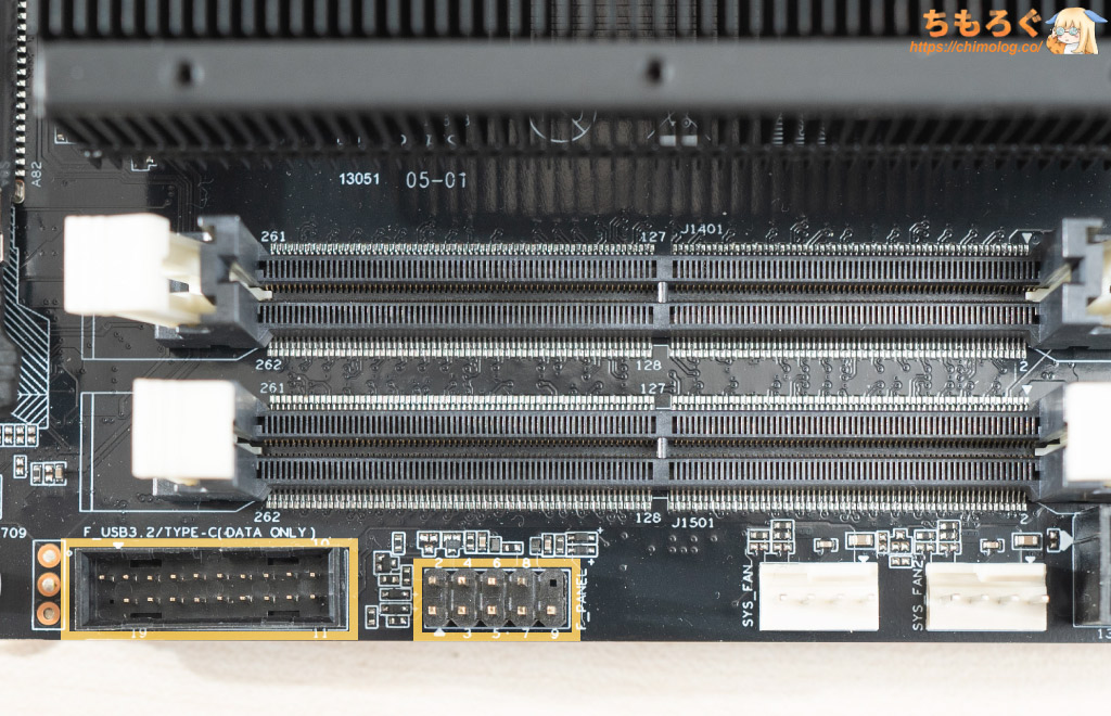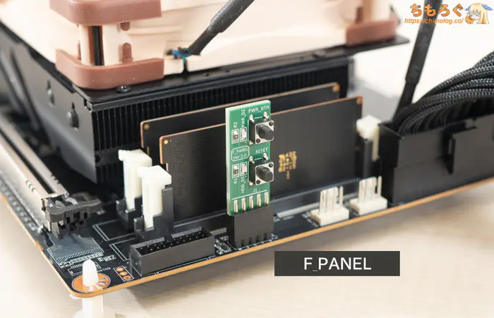 PCケース側のヘッドホン端子につながる「F_AUDIO」や、電源ボタンやリセットボタンにつながる「F_PANEL」ヘッダーも当然ながら実装済み。