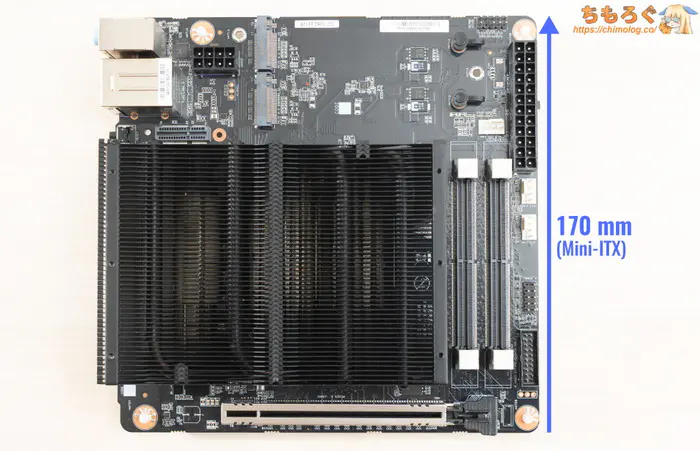 MINISFORUM BD795i SEは、自作PCパーツと同じく「Mini-ITX」規格に準拠します。四方170 mmの正方形です。