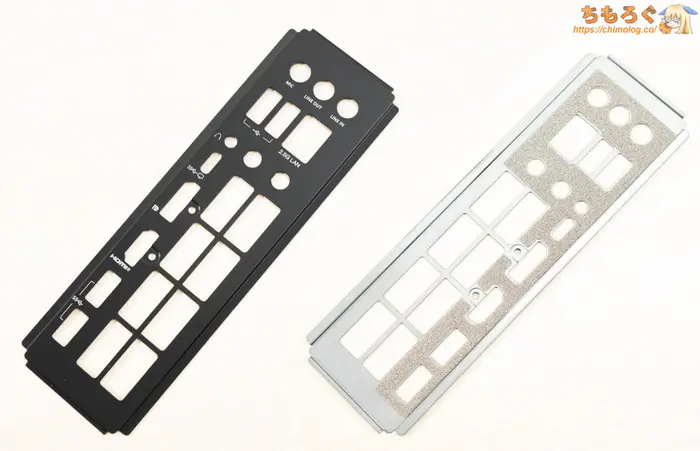 真っ黒なアルマイト処理と、裏面にシールドシートが貼り付けられたI/Oバックプレートです。
