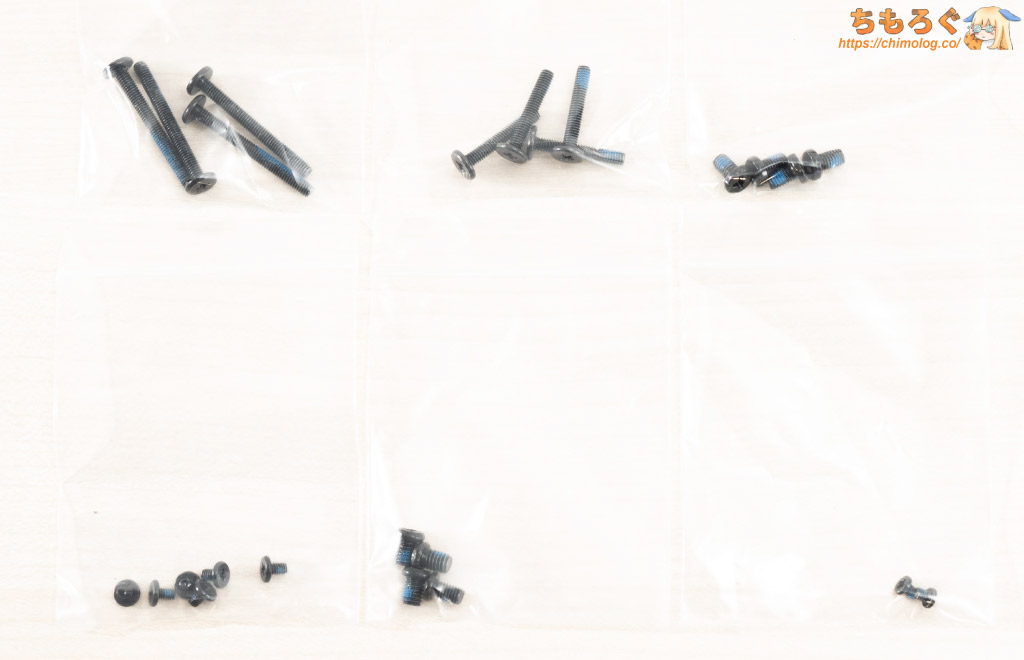 たとえばマザーボードをPCケースに固定するために使う4本のネジは、それぞれミリネジとインチネジが4本ずつ用意されています。