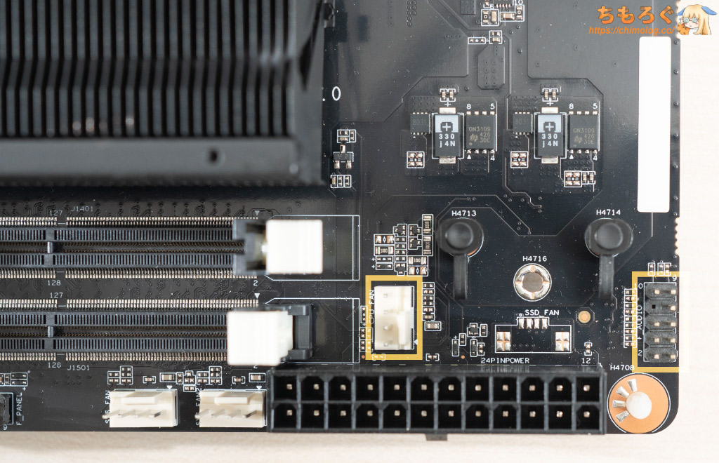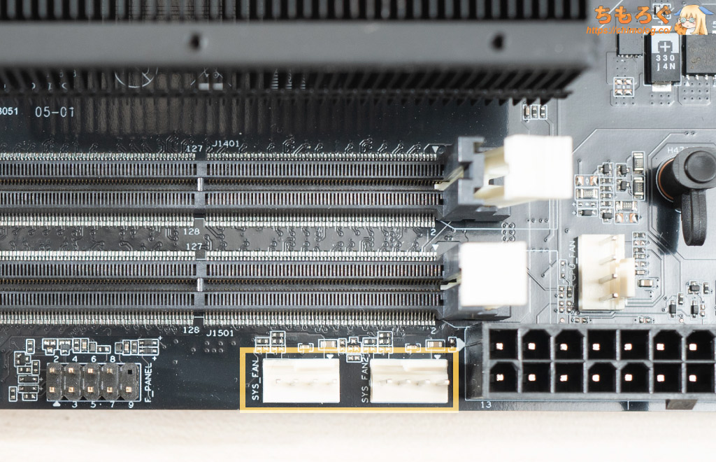 CPUファンやケースファンを接続できる「PWM 4ピン」ヘッダーが3箇所あります。