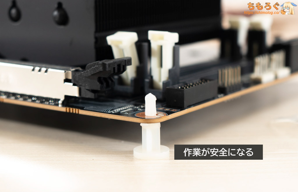 ちなみに、スペーサーを使ってマザーボード本体を地面から浮かせてしまえば、PCケースに入れないバラック状態(実質オープンフレーム)での実運用もできます。