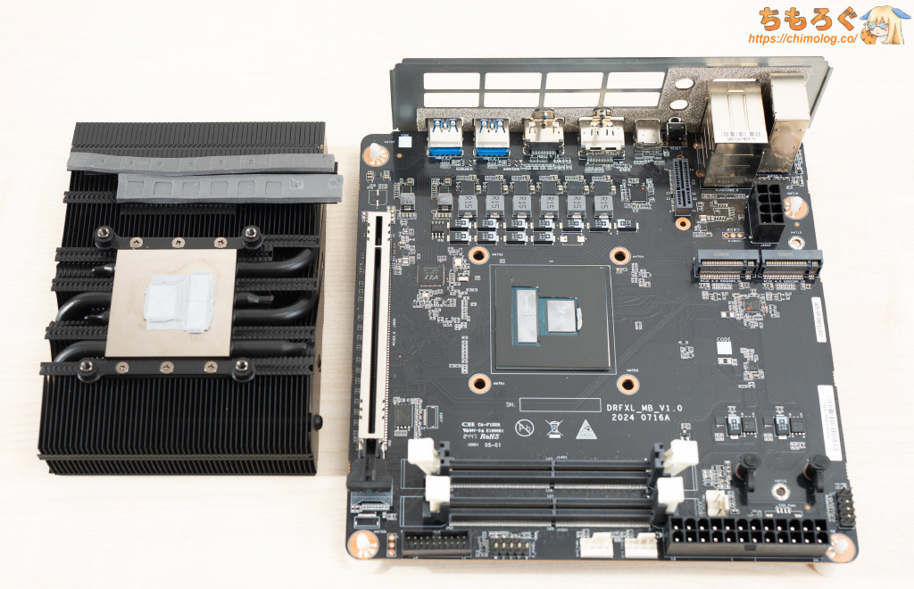 MINISFORUM BD795i SEからCPUクーラー(ヒートシンク)を引き剥がし、マザーボード上に実装されているコンポーネントを目視で確認します。