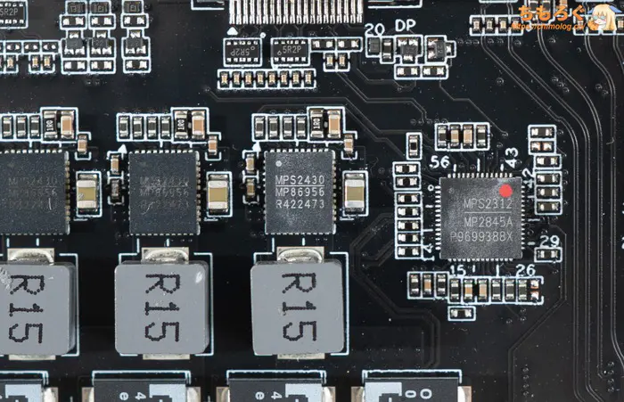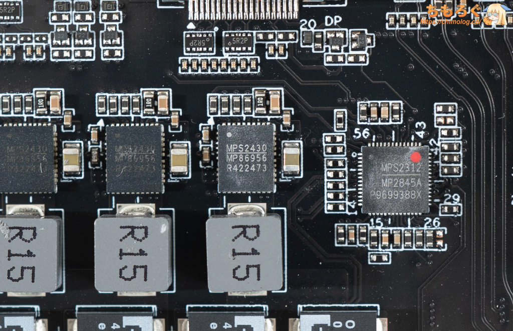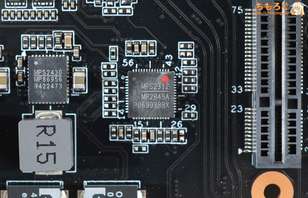 VRMフェーズ全体を制御するPWMコントローラは、MPS(Monolithic Power)製「MP2845A」です。AMD SVI3規格に準拠し、最大6フェーズまで制御できます。