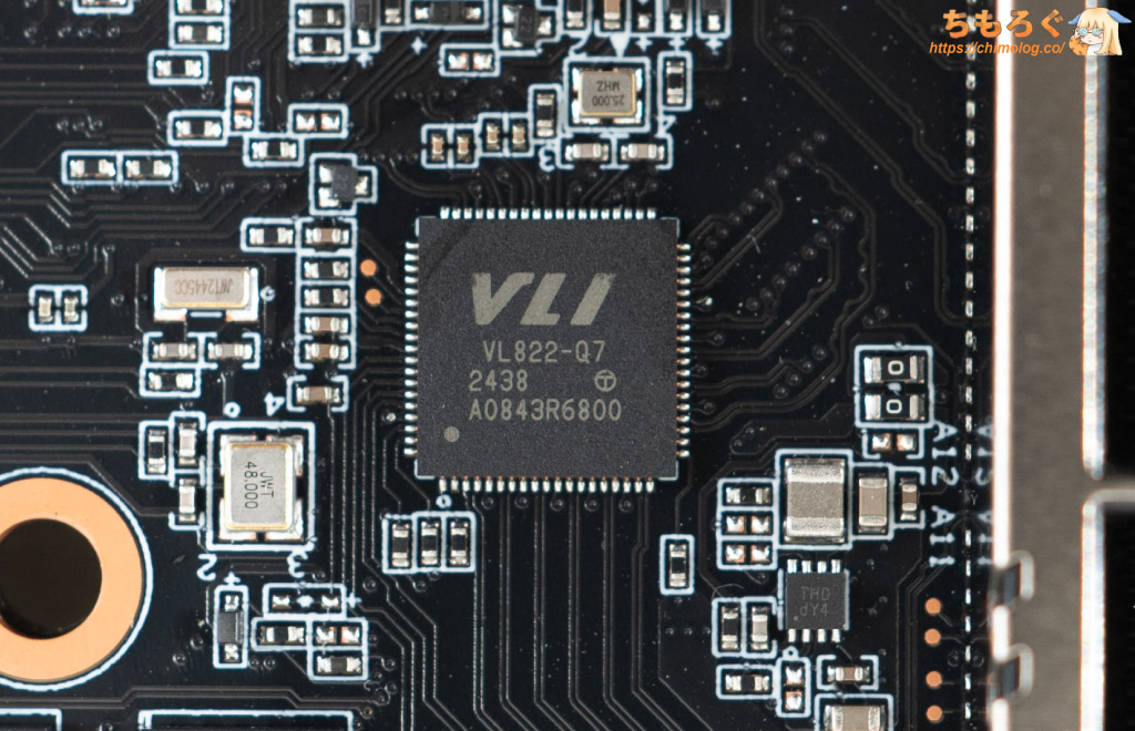 VIA Labs(威鋒電子)製「VL822」コントローラです。USB 5 Gbpsポートを増設するハブコントローラとして実装されています。