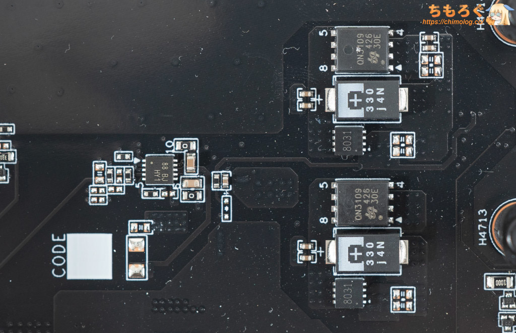 Richtek製「RT8237E」がPWMコントローラ、2個あるuPI Semi製「QN3109」がN-Channel MOSFETです。定格動作(DDR5-5200)程度なら、まったく問題ない内容です。
