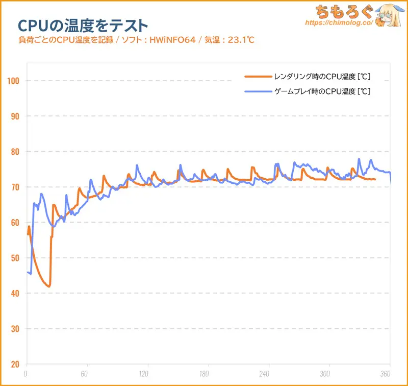 CPUに100%の負荷がかかるCinebench R23ベンチマーク中のCPU温度は最大で76℃、平均70℃です。