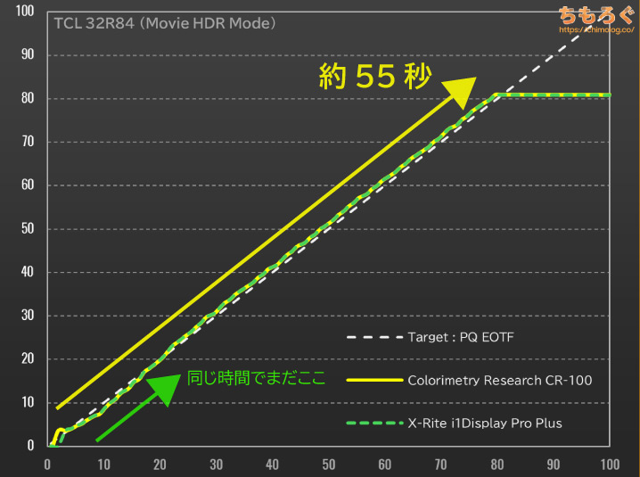 一方、ラボグレードのCR-100なら、わずか55秒の短時間で測定を終えてしまいます。ほとんど0 cd/m²に近い暗部階調を毎秒1サンプル、明るい階調は毎秒3~4サンプルです。
