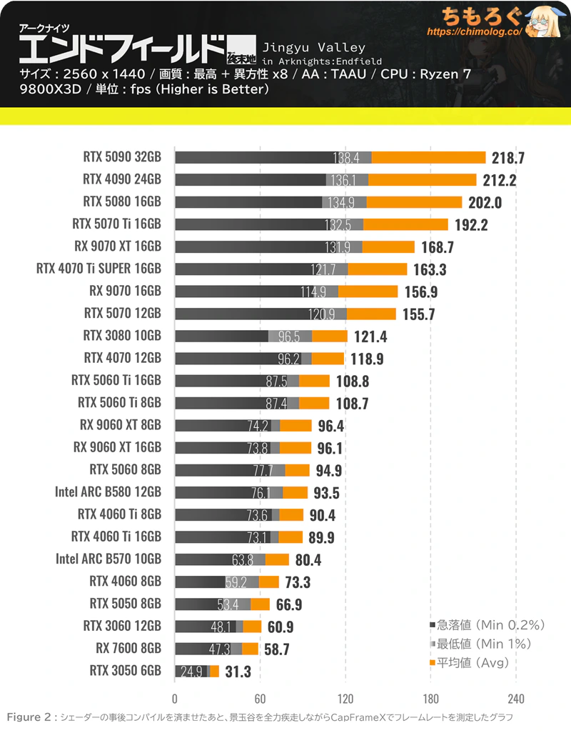 エンドフィールドをWQHD(最高設定)でプレイするのに十分なスペック。フレーム生成(FG 2x)を使えば平均120 fpsも可能です。