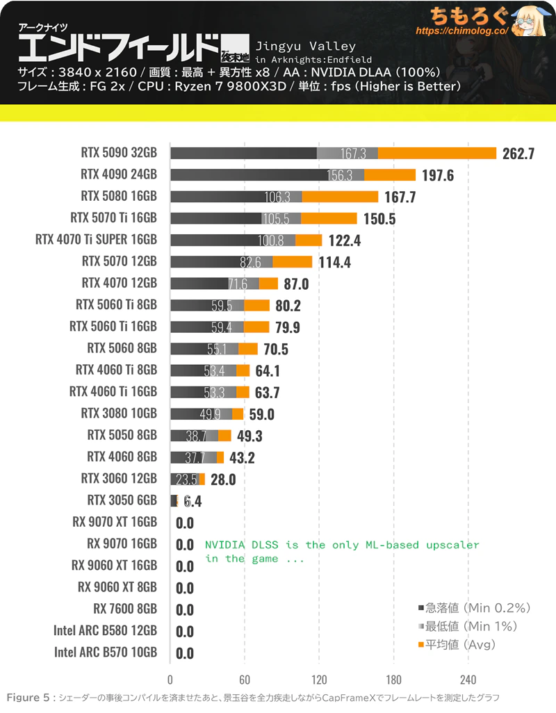 エンドフィールドを4K DLAA最高設定で平均120 fps超でプレイできるうえ、「鳴潮」「白銀の城」「NTE」など次世代グラフィックを備えた最新中華AAAゲームも耐えられる性能です。