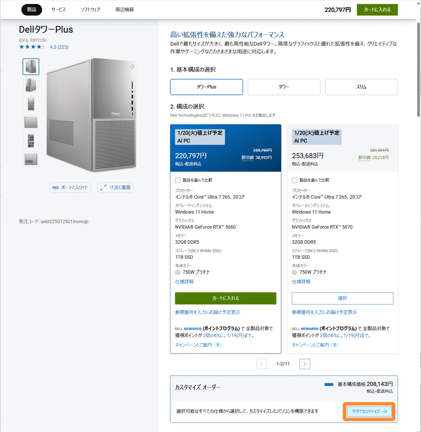Dell タワー Plus」の公式サイトを開いたら、右下にある「今すぐカスタマイズ」をクリックします。