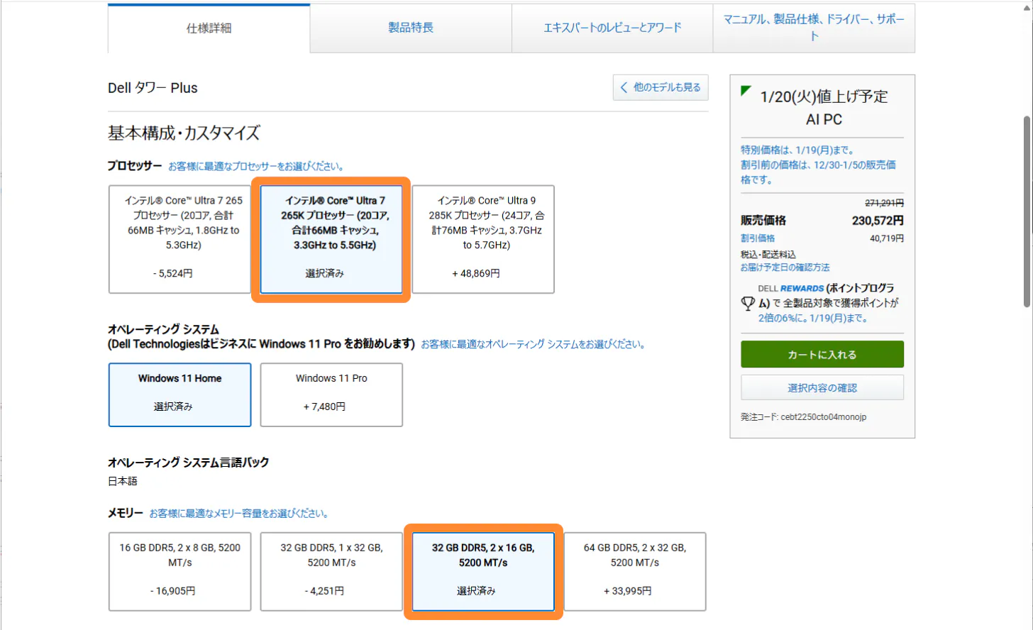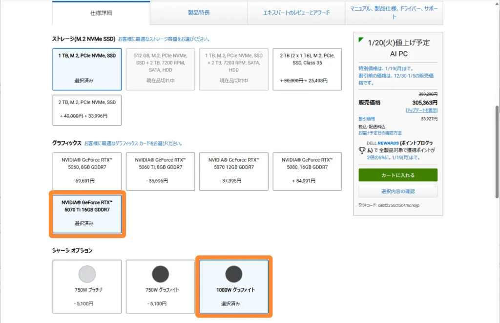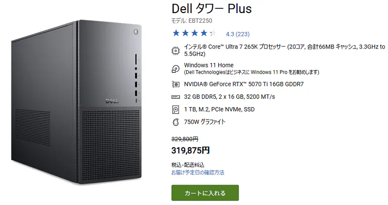• 【30万円台】DELL EBT2250(RTX 5070 Ti)メモリ32GBに設定して買えました