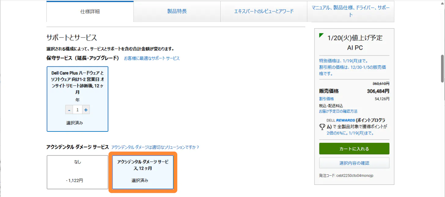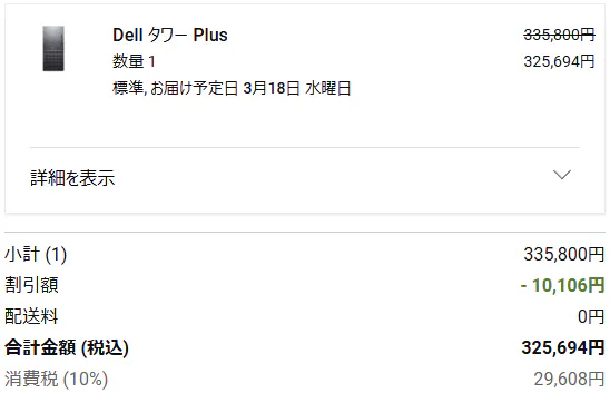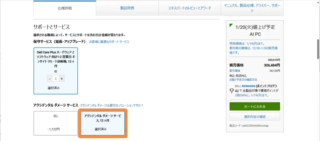 合計30.7万円で完成です。6%のポイント還元(DELLリワード)が約1.6~1.8万ポイントも付与され、実質29万円台です。