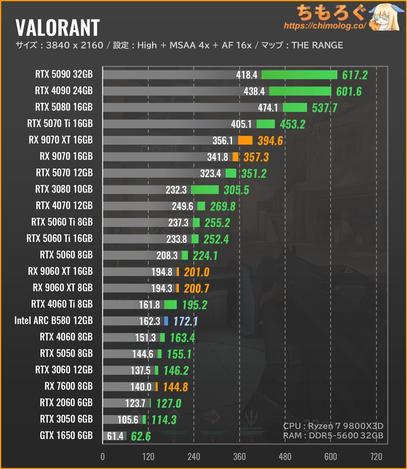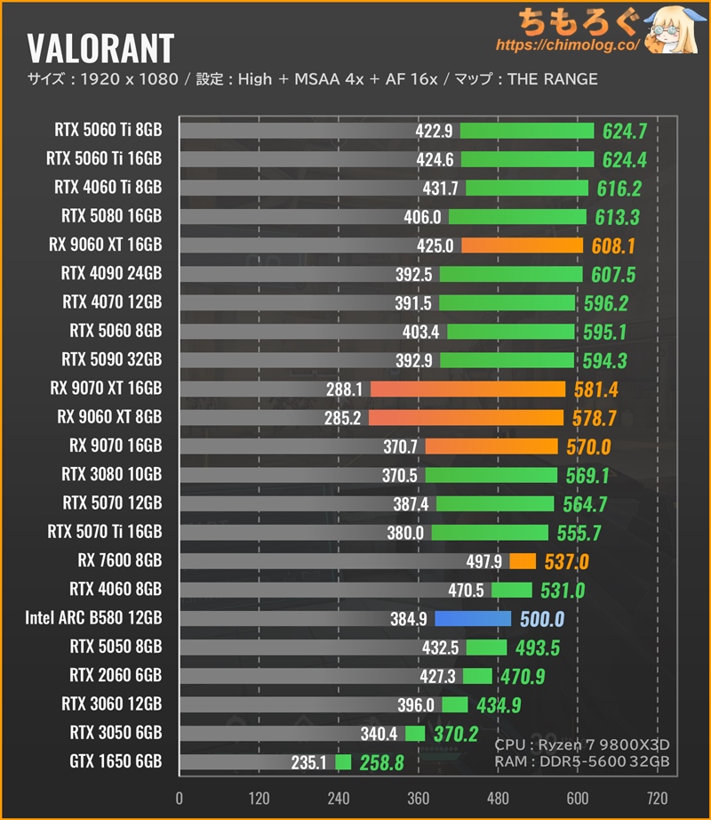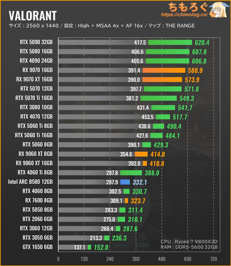 予算が少ないから安く済ませたいなら「RTX 5050」または「RX 7600」を推します。VALORANTをフルHD(平均240 fps以上)でプレイするのに十分なグラボです。