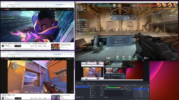 メモリ使用量が少ないゲームだから、フレームレートはまったく変化なかったです。YouTubeを同時に2つ再生しながら、OBS Studioで録画しても、メモリ容量16 GBと32 GBでほぼ同じ性能です。