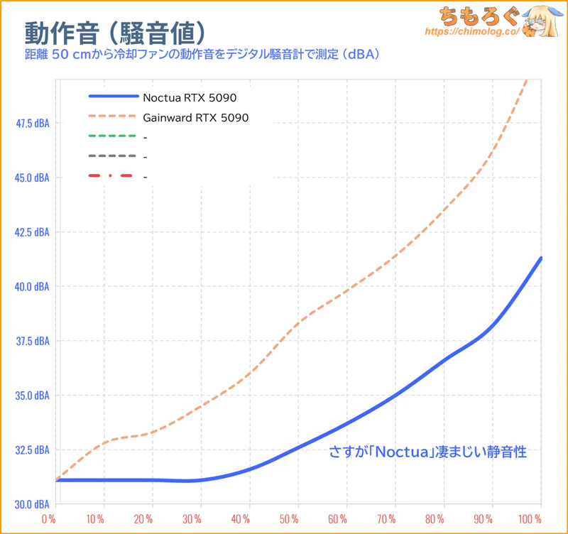 標準ファン(88 mm径)は静かな領域(< 32.5 dBA)をすぐ逸脱するのに対し、Noctua(120 mm径)はPWM 45%まで静かな領域にとどまります。