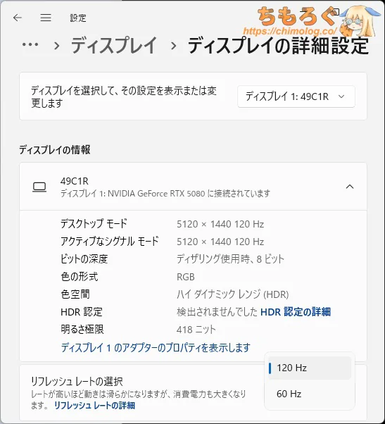 映像端子は全部で3つあり、HDMIポートが最大60 Hz(5120×1440)まで、DPポートとUSB Type-Cで最大120 Hz(5120×1440)に対応します。