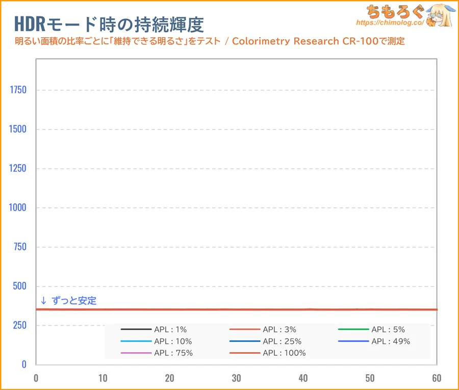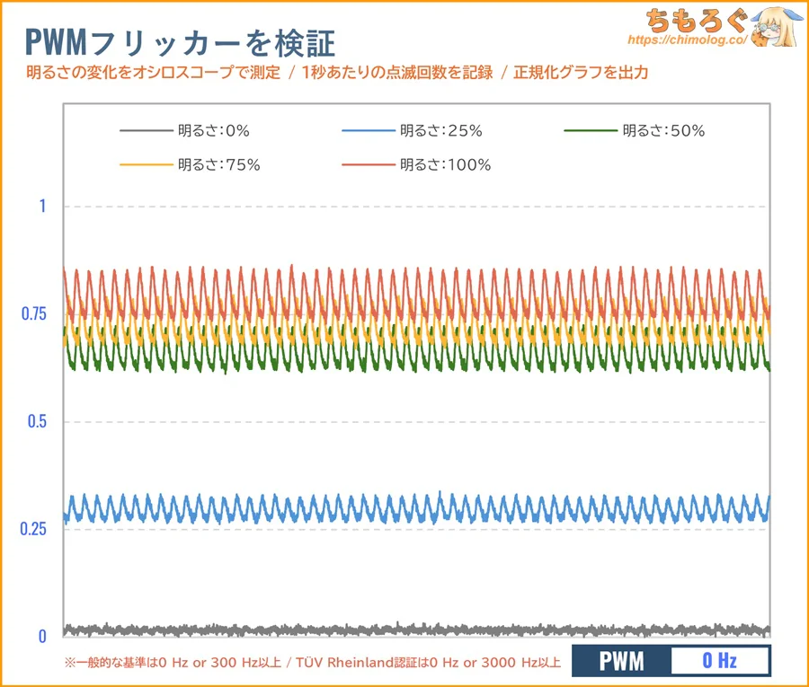 眼精疲労などが理由で、夜間に暗い画面を好む人にとって嬉しい仕様です。目にやさしいらしい120 cd/m²前後は設定値25%でほぼ一致します。