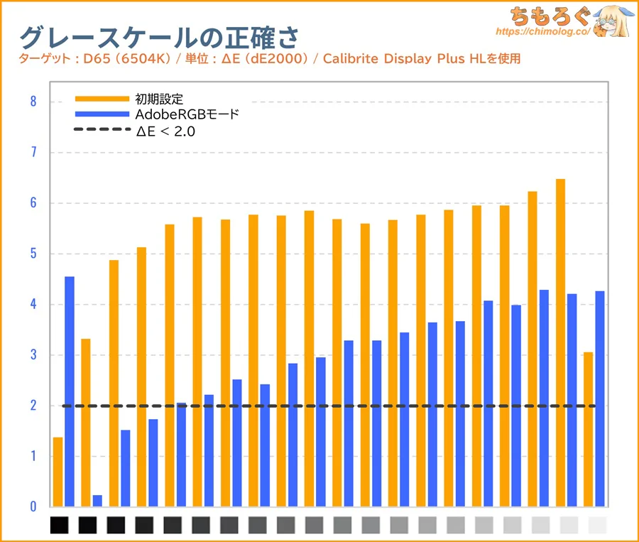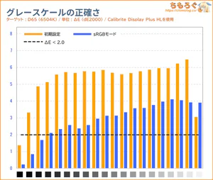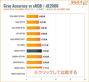 INNOCN 49C1Rは初期設定のままだと、グレーの精度も色の精度もまったく合ってません(ΔE > 2.0)。