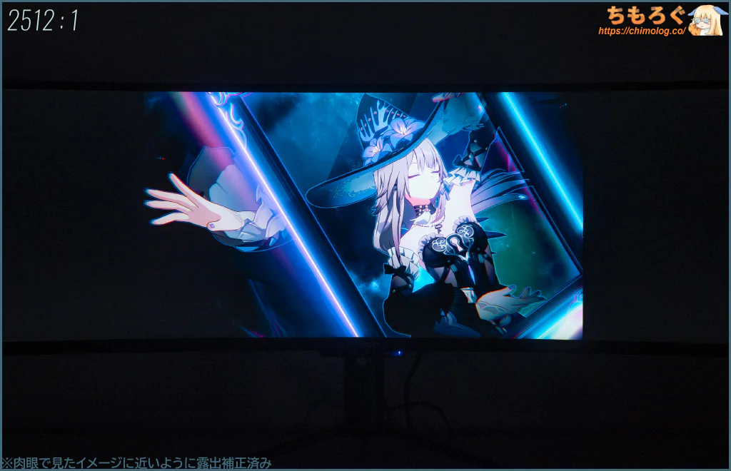コントラスト比(実測)は2512:1です。普通の平均的なIPSパネルが約1100:1程度に対し、なんと2倍以上も高いコントラスト比です。