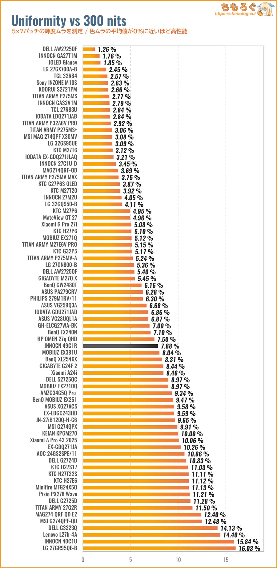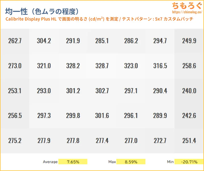 色ムラ(輝度ムラ)の測定結果は平均値で7.9%です。エッジライト方式のバックライトを使っているなら、平均的な色ムラ性能です。