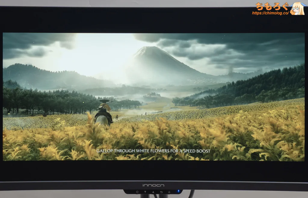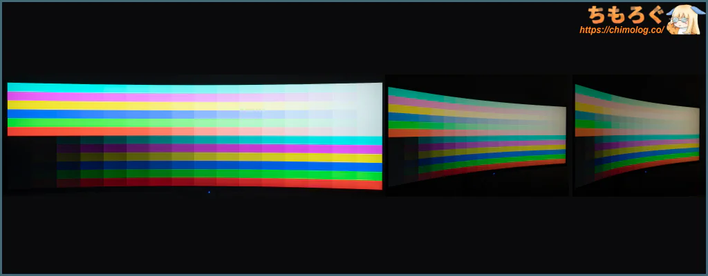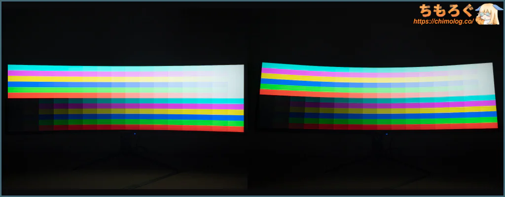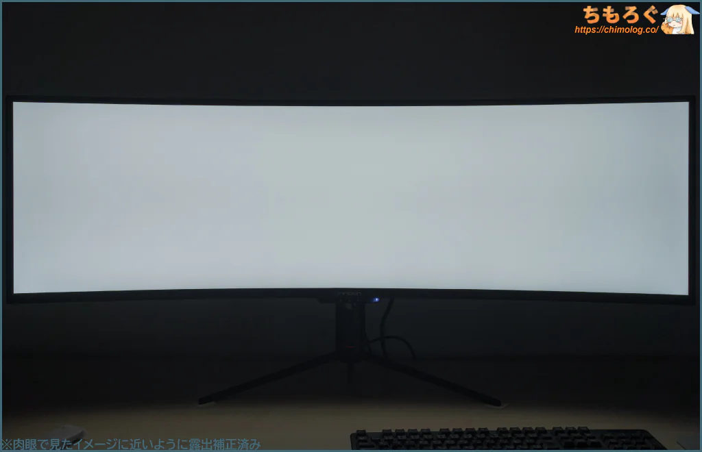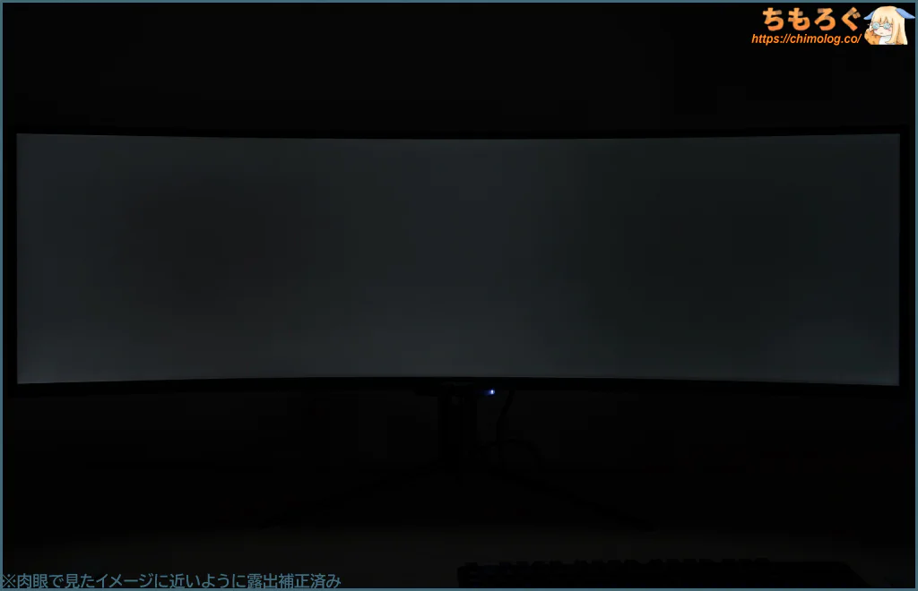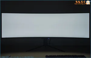 32:9もの超広角ワイドなので、意外とゲームプレイ中にほとんど気にならないですが、オフィスワークや静止画を表示するとパネルの左右端っこが暗く感じます。
