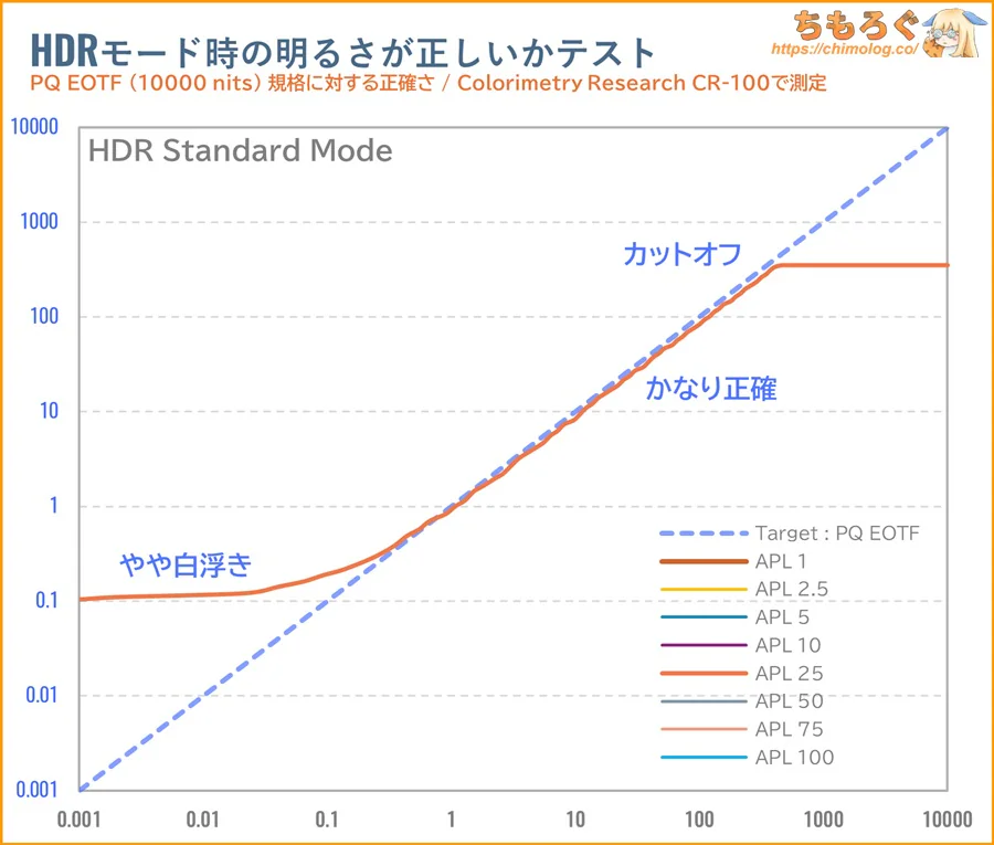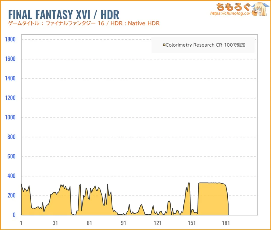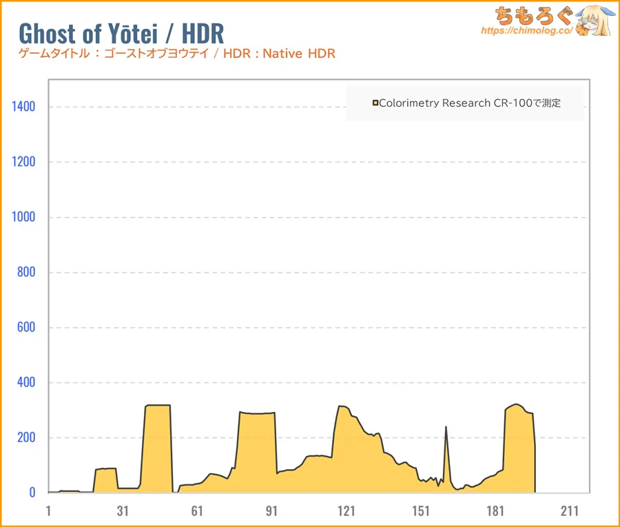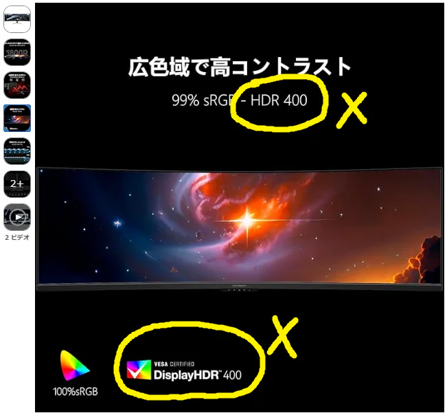 | HDRコンテンツの再現性 Display HDR 400認証すら合格できない、必要最低限ラインを下回る非力なHDR性能です。ピーク輝度が暗く、コントラスト比も伸びず、HDRコンテンツの再現性に乏しいです。 |