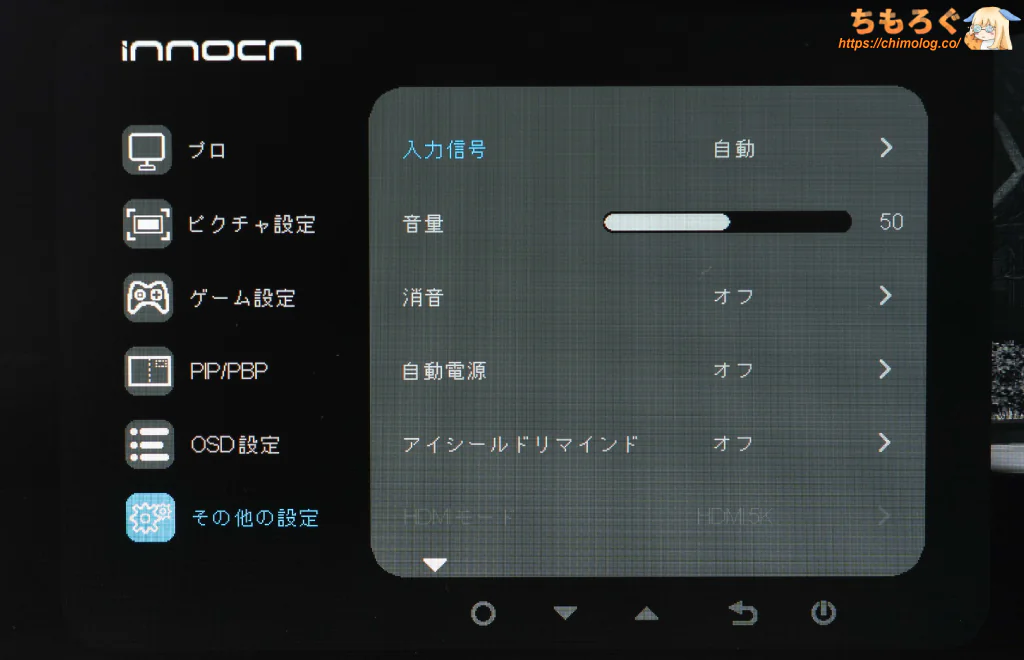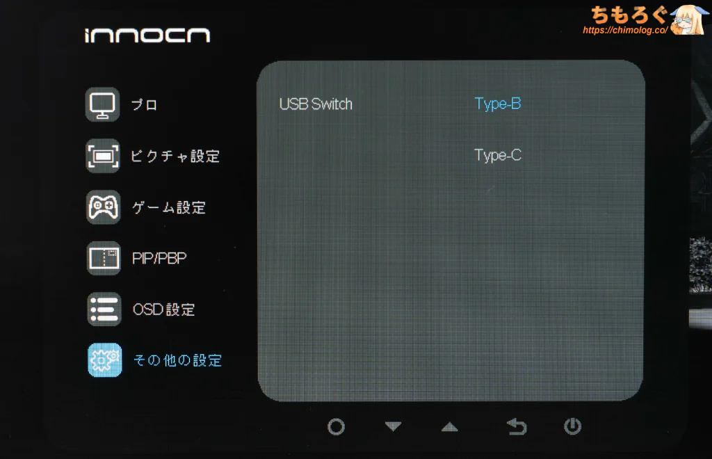 モニター本体の中央底面にある「物理ボタン(5個)」を使って、ちまちまとOSD設定を操作できます。とても面倒くさいです。