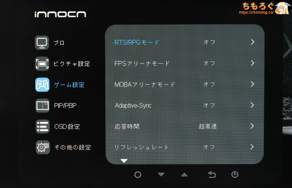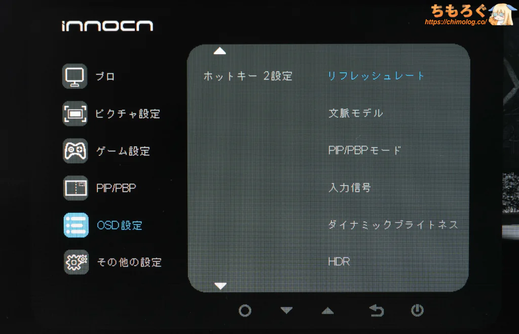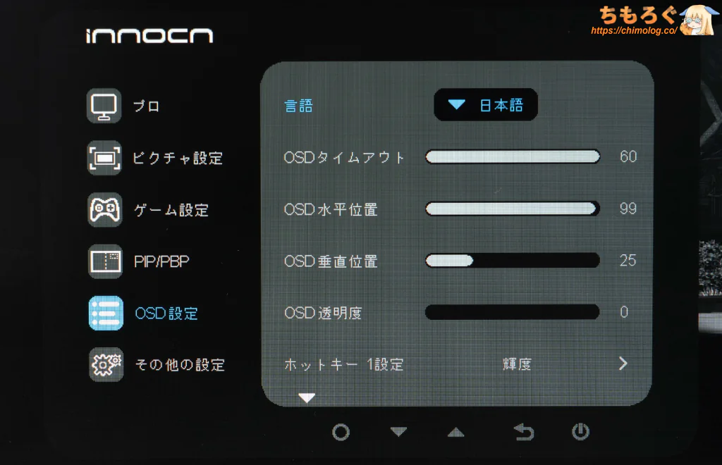 使いづらい5個のボタン操作ですが、OSDメニューのレスポンス自体はかなり良好です。5ボタン操作に慣れさえすれば、意外とサクサク設定が進みます。