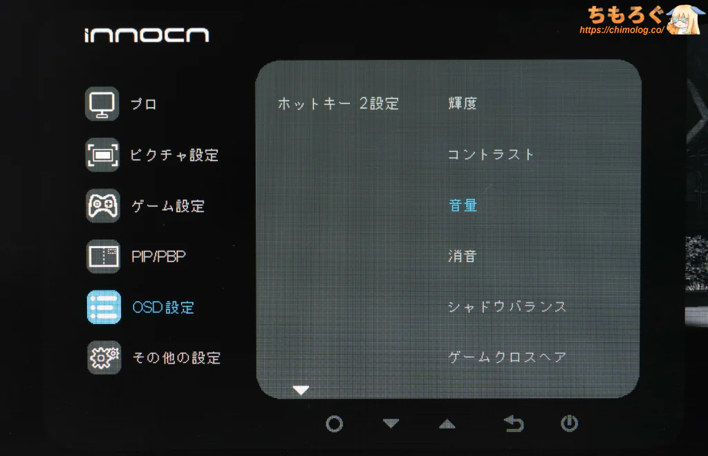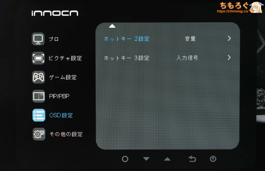 ショートカットボタン(3個)に、任意の項目を登録できます。OSD設定 → ホットキー設定から、任意の項目を選んで登録します。