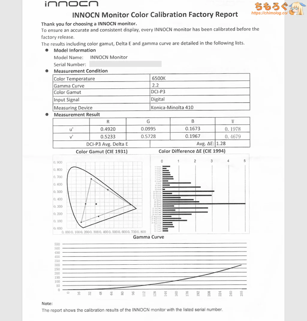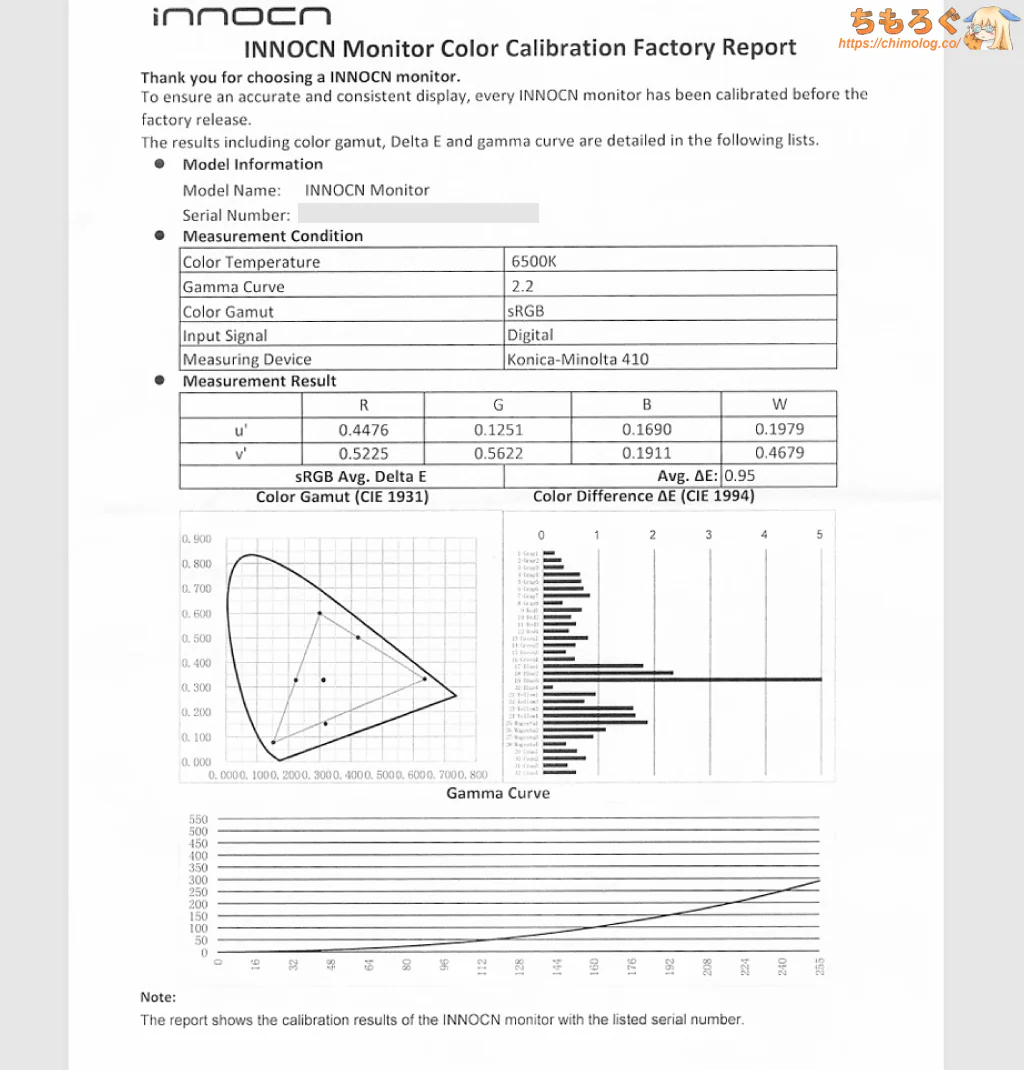 出荷時キャリブレーションレポートが3枚付属します。なお、他社と同じく目視補正(メタメリズム障害)を考慮しないため、実用上あまり役にたたない出荷時校正です。