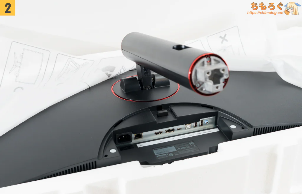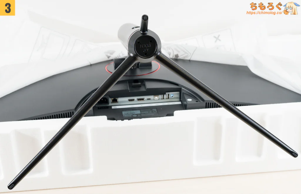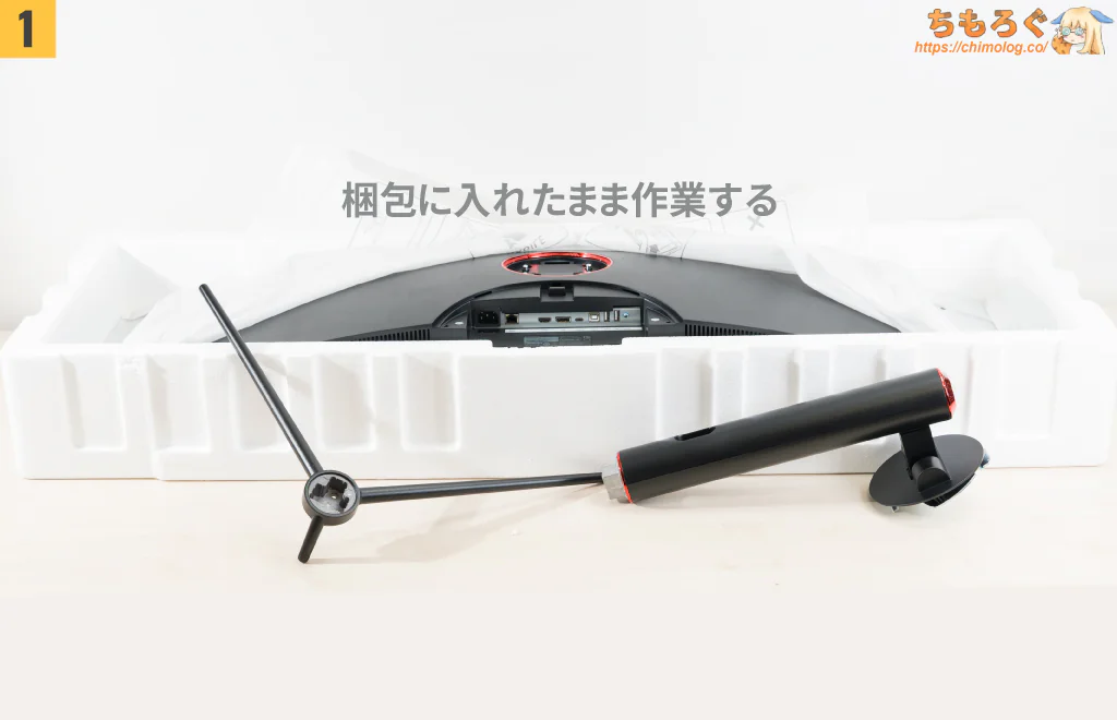 厚みのある高密度発泡スチロールでできた梱包材で、がっちり梱包されています。上の段に付属品、下の段にゲーミングモニター本体が収まってます。