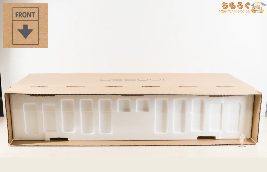 箱に書いてある「FRONT矢印」を床に向けてから開封して、付属品と本体を順番に取り出します。