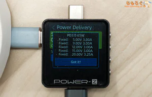 負荷シミュレーターを挿し込み、電圧を20.0 Vに、電流を3.23 Aまで盛り付けるとメーカー公称値の65 Wを実際に出せます。
