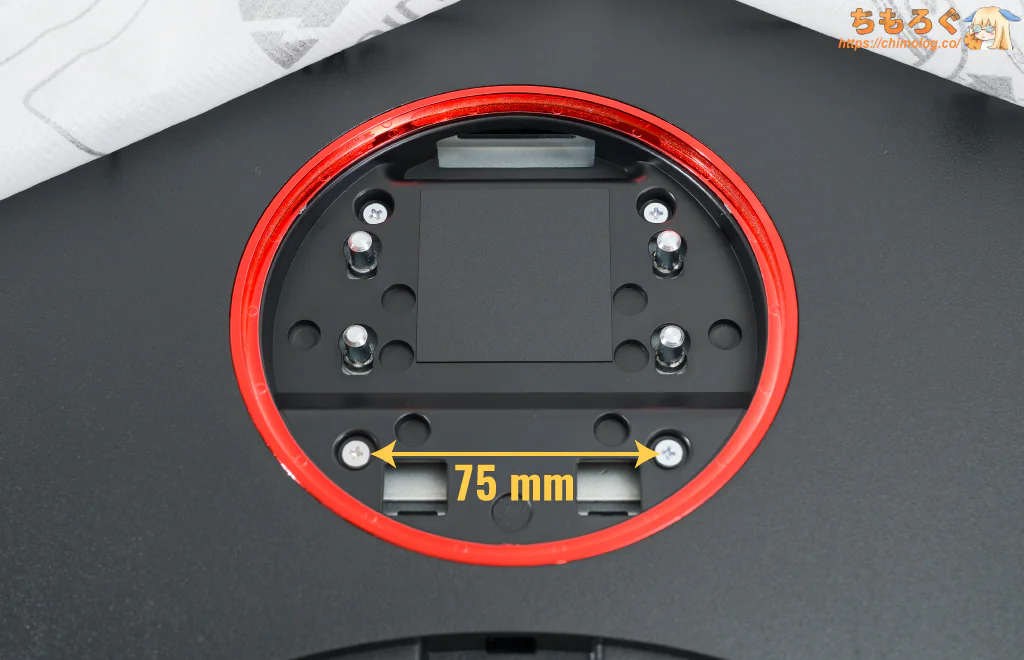 別売りモニターアームを取り付けるのに便利なVESAマウントは「75 x 75 mm」に対応します。