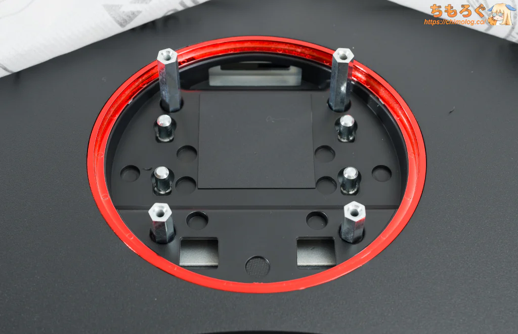 モニタースタンドの中央に、ケーブルを通すための「ケーブルホール」が空いています。
