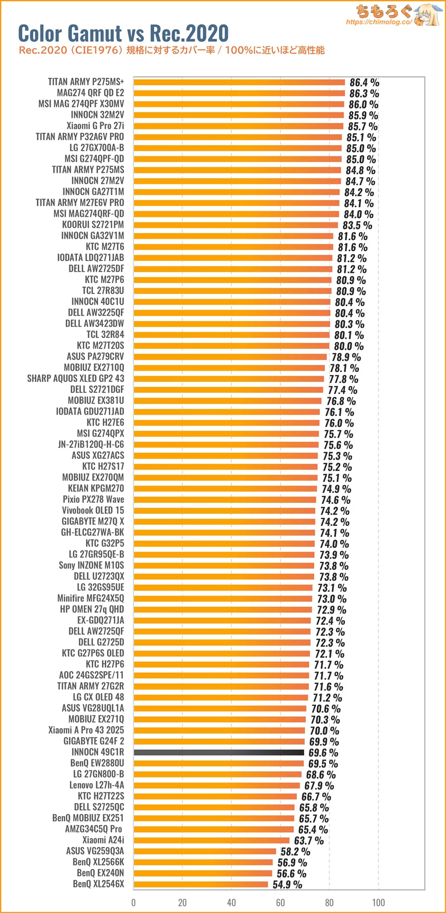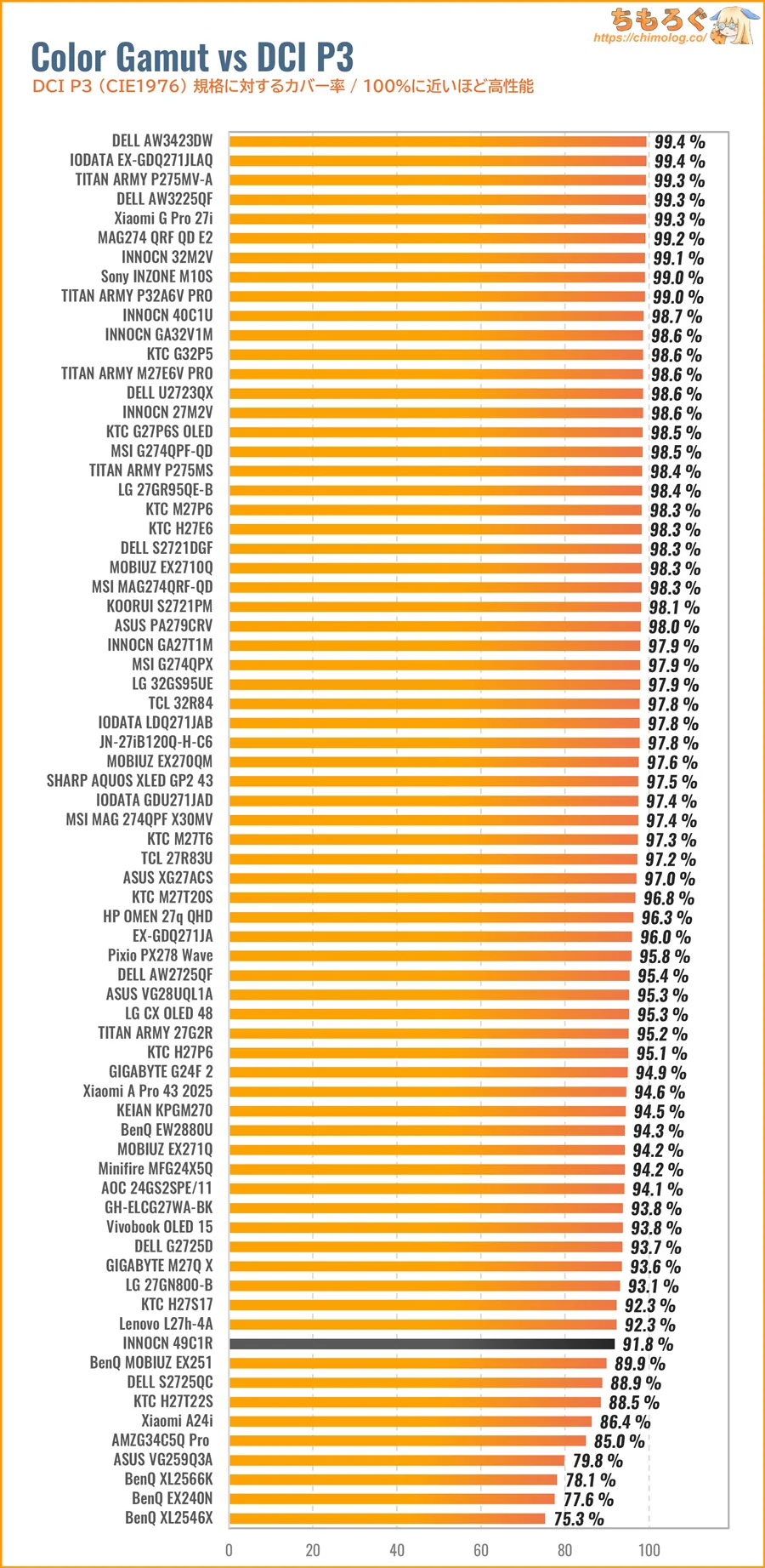 INNOCN 49C1Rはそこそこ広い色域ですが、ハイエンド液晶モデルで導入が進む「量子ドット」パネルにはまったく届きません。