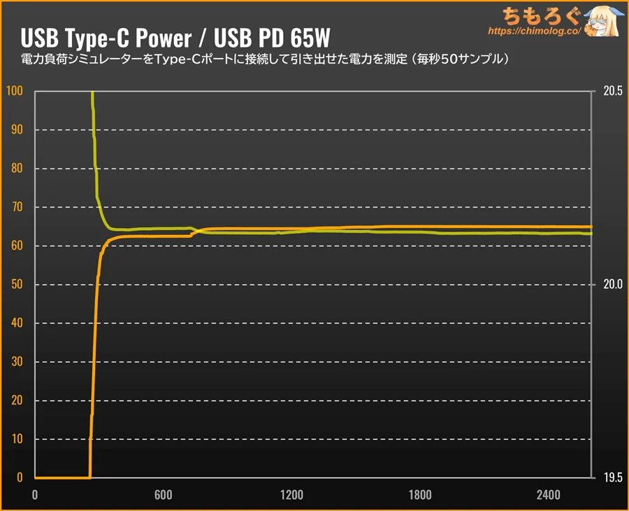 負荷を掛けても20.0 V以上の出力電圧を維持し、USB規格で求められる±5%のレギュレーションに収まります。