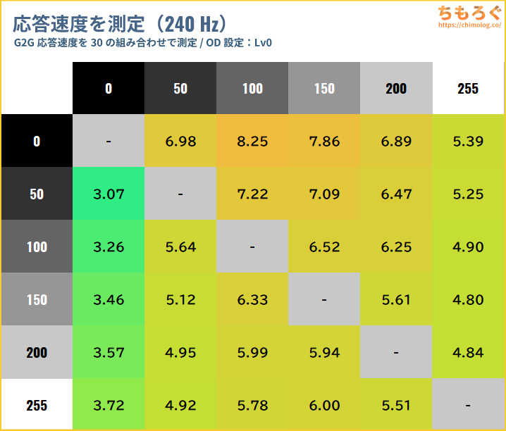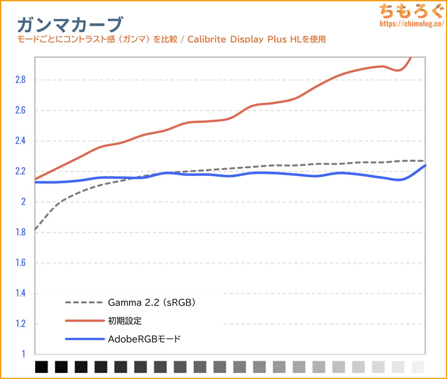 INNOCNが手掛けるゲーミングモニターらしく、クセが少なく手動で調整しやすい素直な特性でした。グレースケールがほぼぴったり一致し、ガンマもそこそこ修正できました。
