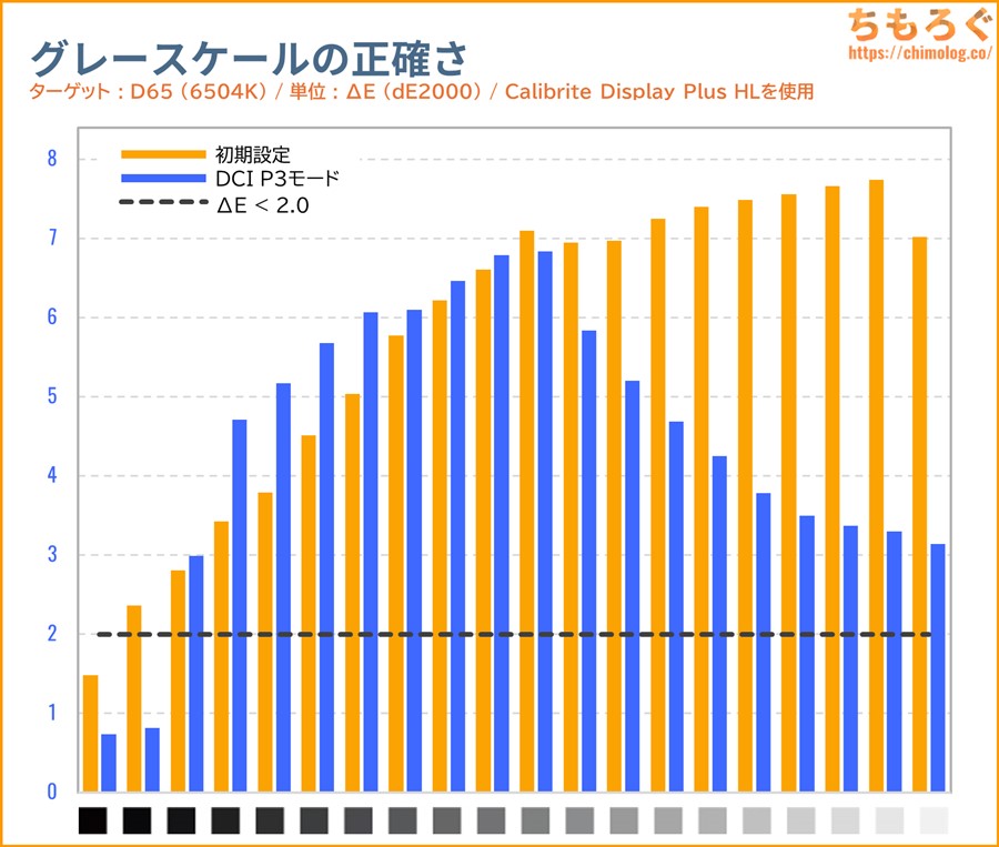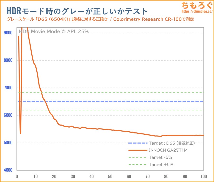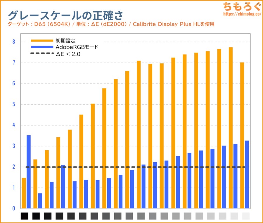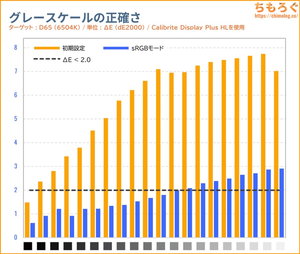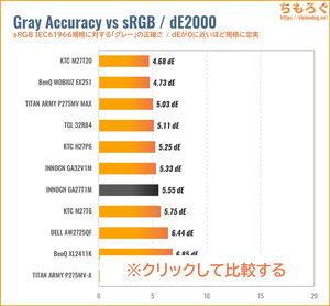 INNOCN GA27T1Mは初期設定のままだと、グレーの精度も色の精度もまったく合っていない(ΔE > 2.0)です。